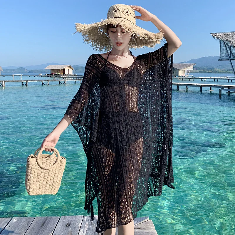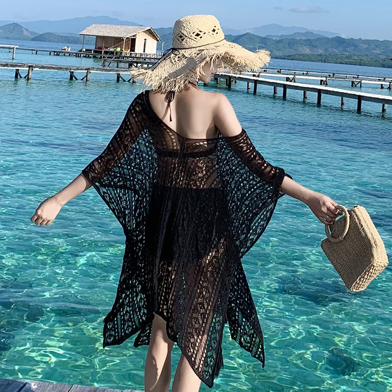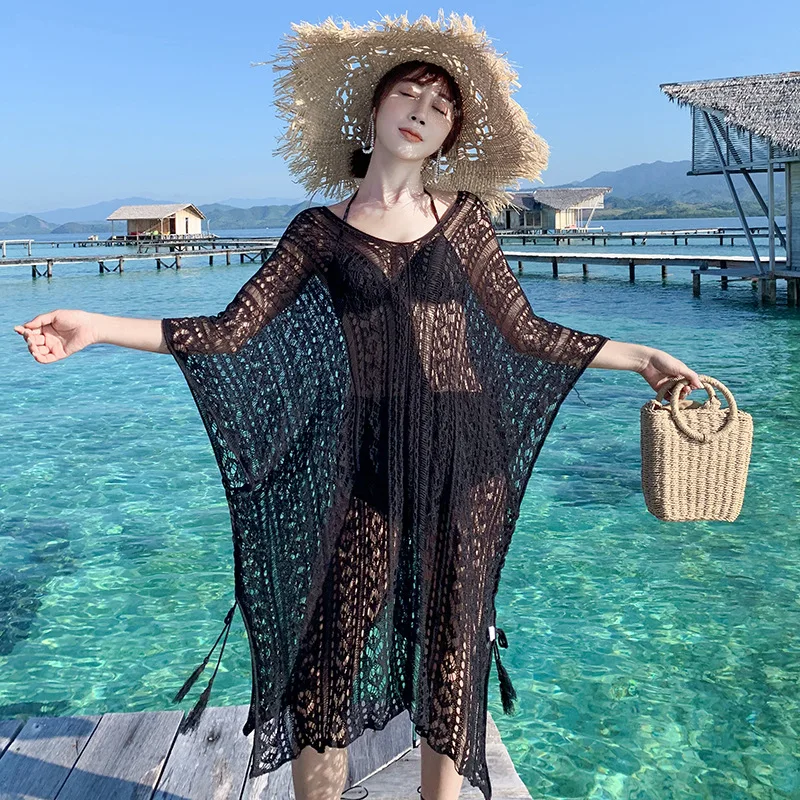 ORIGINAL Women Beach Boho Dress Oversized Cover Up Loose Hollow Out Crochet Floral Dress Bat Sleeve Side Spl